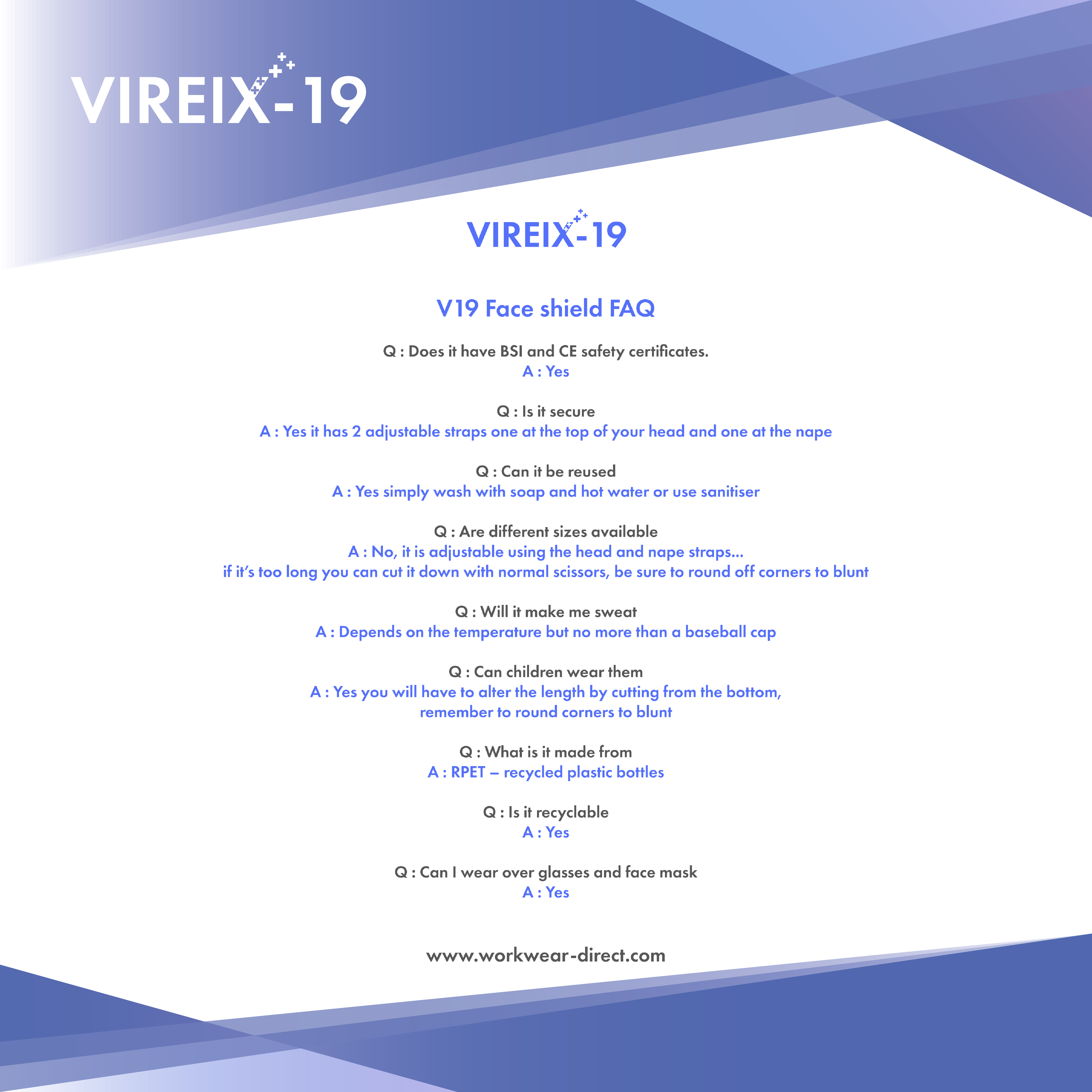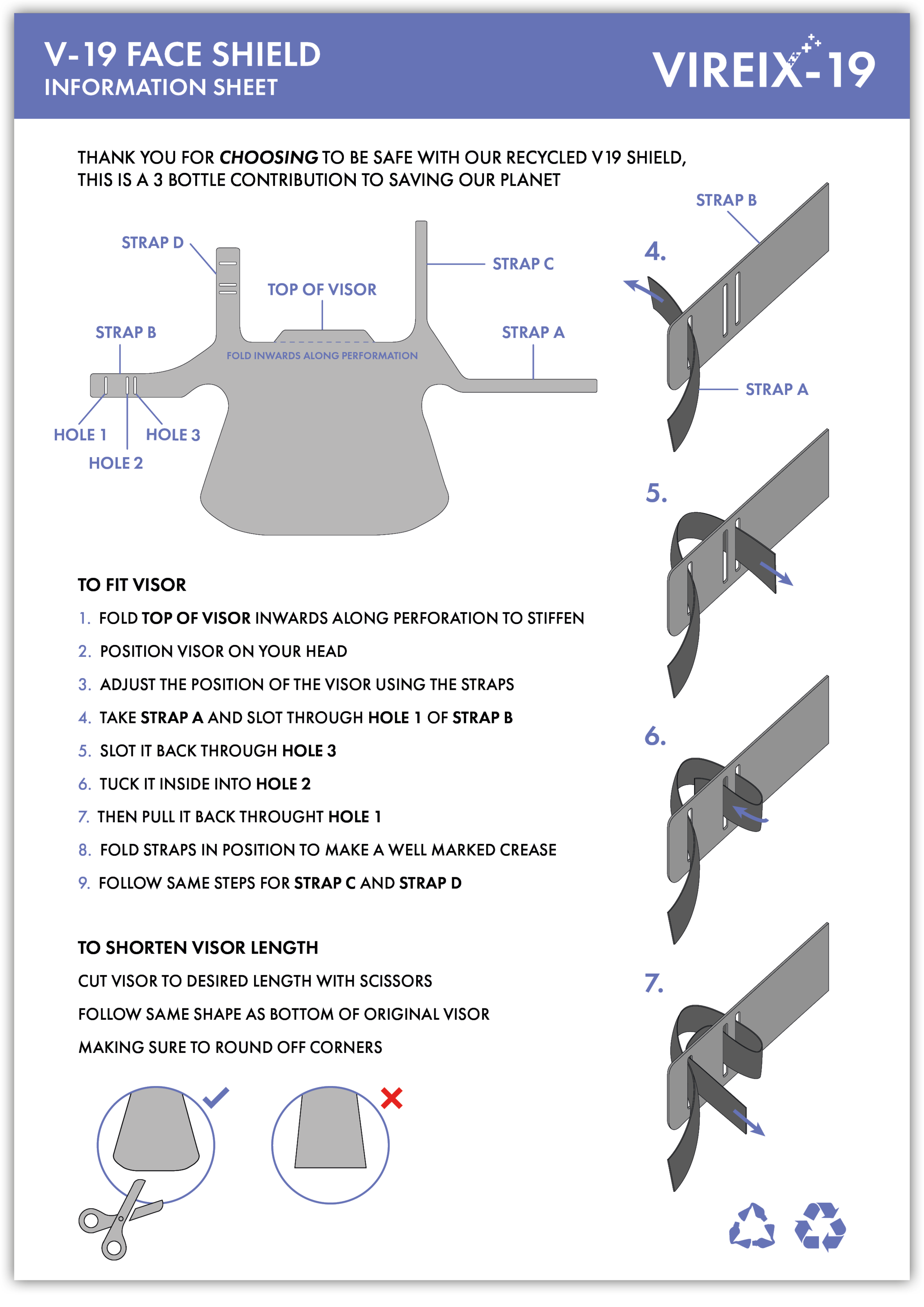 V19 face shields are made from RPET - recycled plastic bottles. Every face shield made utilises approximately three recycled plastic bottles making V19 Face Shields carbon negative. Thus, it not only saves lives, it also contributes to saving our planet.